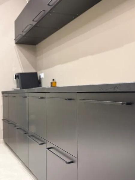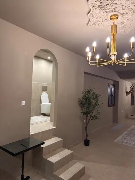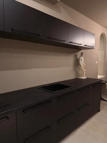 Обединеното централно пространство се съчетава хармонично със съвременната матова черна кухня с минимален дизайн, с удобни складови помещения и чисти линии. Арките, скулптурните елементи, земните тонове и внимателното осветление подчертават елегантността и цялостната архитектурна идентичност на имота.