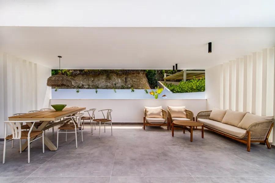 Außenbereich mit Möglichkeit zur Platzierung eines Esstisches für 12 Personen und einer Sitzgruppenecke unter Pergolen
