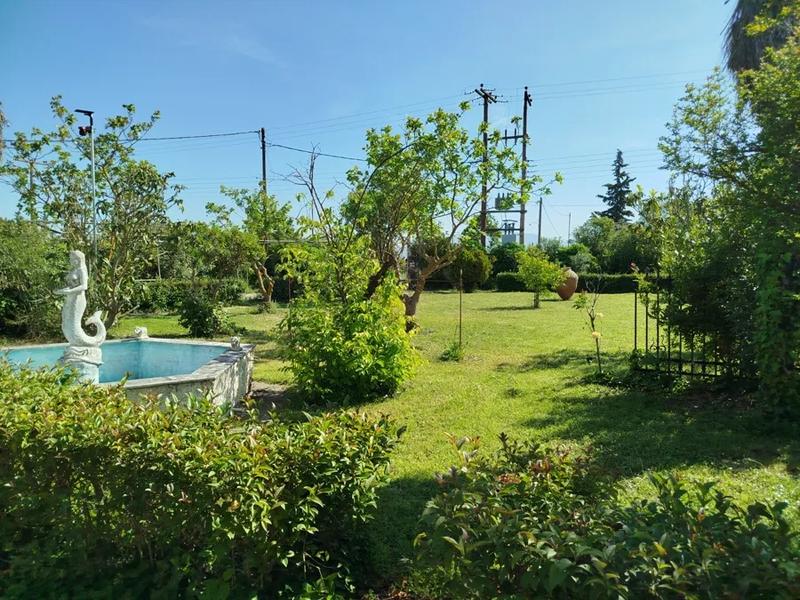 Der umgebende Raum ist vollständig gestaltet mit Garten, Obstbäumen, Oliven, Rasen und dekorativem Brunnen, was ein Gefühl von Ruhe und natürlicher Schönheit schafft.