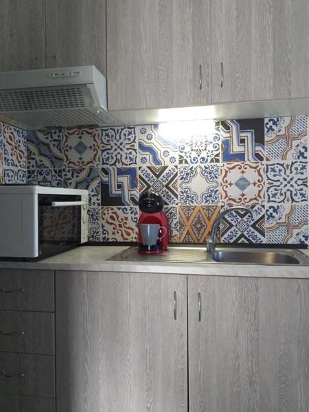 Die Wohnung im ersten Erdgeschoss ist 43 m2 groß und besteht aus einem offenen Raum mit Wohnzimmer und Küche, 2 Schlafzimmern und einem Badezimmer. Die Wohnung im zweiten Erdgeschoss (32 qm) verfügt über einen offenen Raum (Wohnzimmer mit Küche), 1 Schlafzimmer und 1 Badezimmer. Die anderen 3 Wohnungen, 2 im ersten Stock und 1 im zweiten Stock, sind jeweils etwa 25 qm groß und verfügen über einen offenen Raum (Wohnzimmer und Küche), ein separates Schlafzimmer und ein Badezimmer. Jede Wohnung verfügt über einen geräumigen Balkon mit Sitzgelegenheiten im Freien. Die Wohnung im zweiten Stock verfügt über eine große Terrasse (Penthouse).