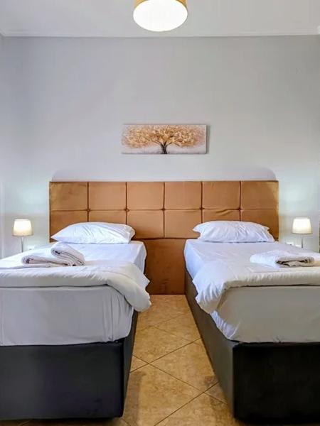 Each apartment includes: living room with kitchen, 2 bedrooms, bathroom, balconies