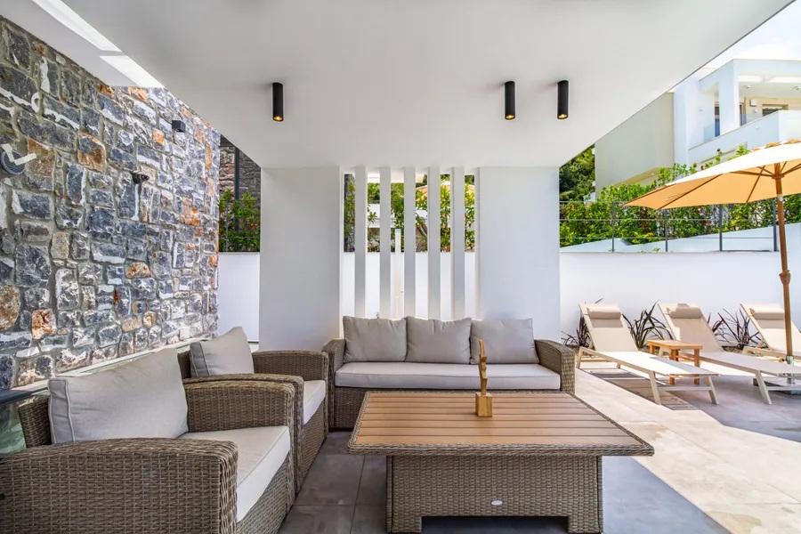Spațiu exterior cu posibilitate de așezare a unui set de masă pentru 12 persoane și a unui colț de lounge sub pergole
