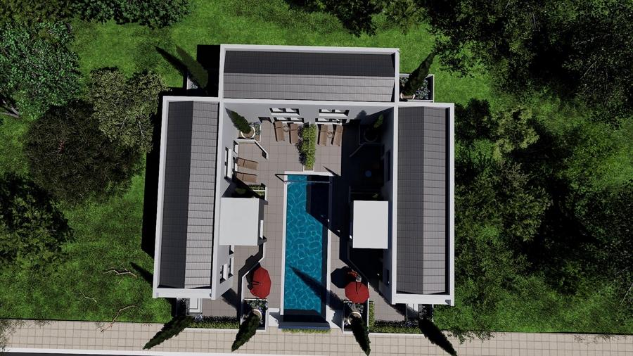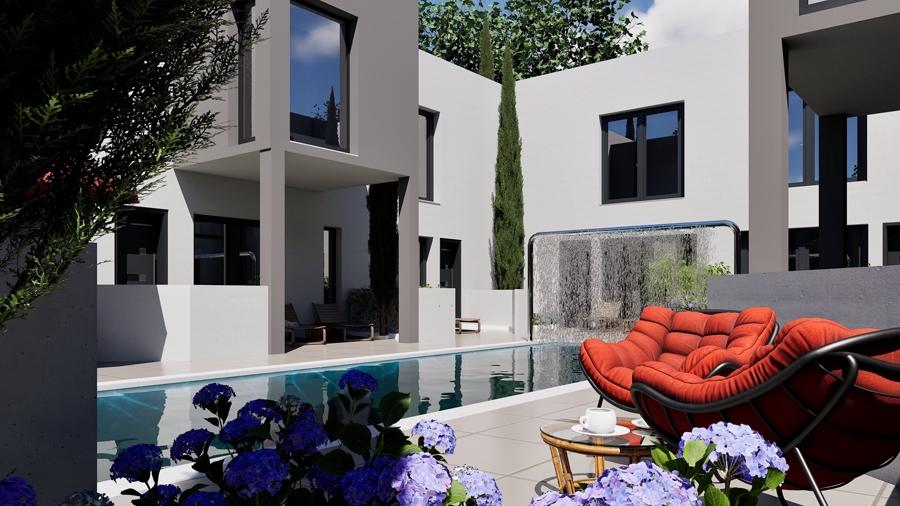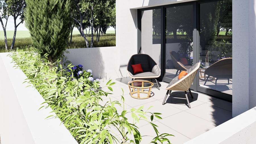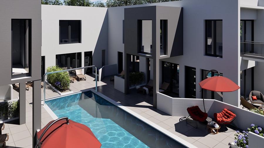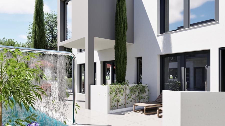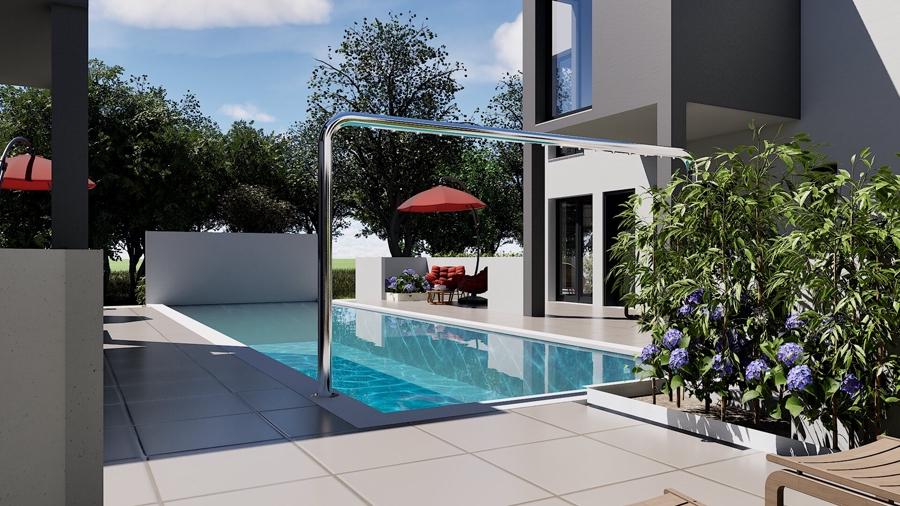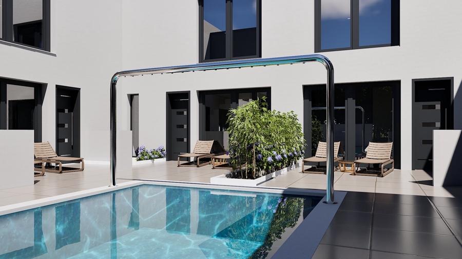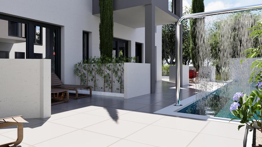 Privatni spoljašnji prostor pojačava ekskluzivnost stana, dok pogled na zajednički bazen sa vodopadom stvara poseban osećaj opuštanja i visoke estetike.